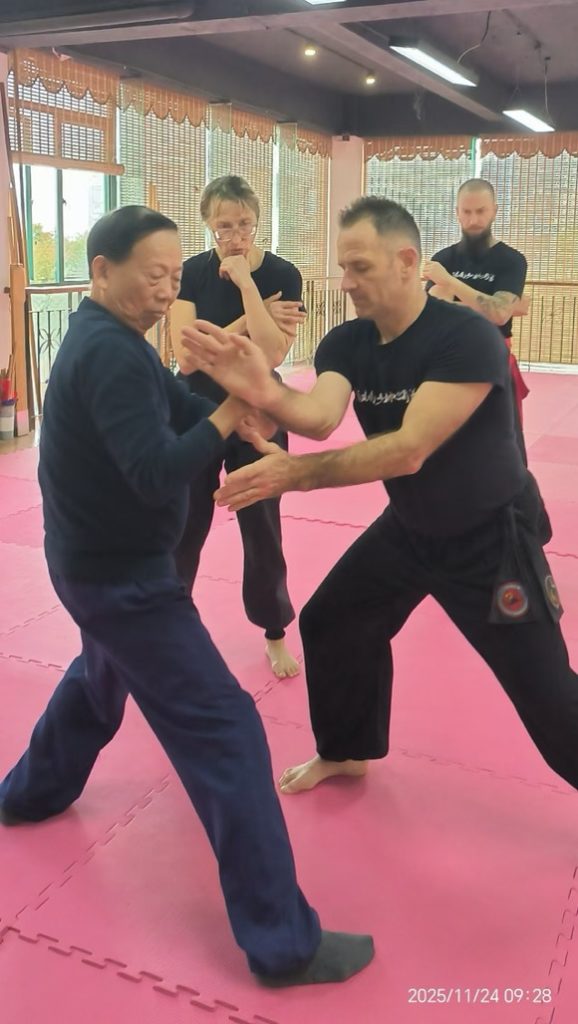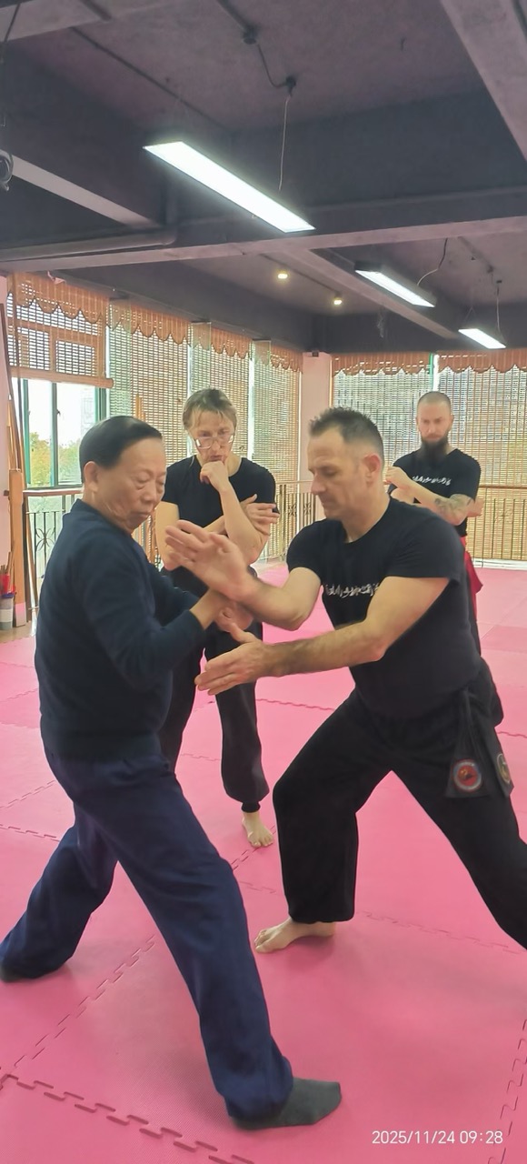 Master Lin at 82 Never disappoints, when ever we start to apply the fighting methods, he comes to life and demonstrates his depth of knowledge. The smallest detail can change the success of application or what to do when a person defends how to change to the advantage. Often as Masters they just do what is required but the newer students need to see it and break the when and why’s to learn. His whole life’s dedication is obvious as soon as he touches you and this one of the reasons why I return each year. At one point today we were doing a sticking hands section and I was higher to save his legs… Then he said go lower and happily stayed there for the whole exercise.