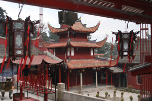 Up at the temple, welcoming saffron robed monks were preparing for some kind of service in front of a gigantic golden Buddha. Incense, the surprisingly fast and rhythmical solid wooden drum and an occasionally sounding bell accompanied the chanting which was mostly divided into two lines of voices singing four notes apart with individual singers and elaborate ornamentation. It was deeply impressive and much more complex than mere generalised chanting. The courtyards were full of people lighting incense candles to departed relatives, the smoke wafted through covered walkways lined with scarlet lanterns. Everywhere you looked there were dragon ornamented pagodas and in the distance a further and higher mountain. Not a bad place then.
