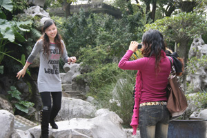 Two park gardeners watched us with unblinking concentration…it was probably that staring at Westerners was more interesting than getting on with their work but it may have been that we were foreigners doing a traditional Eastern tradition by a pagoda on the lakeside with bamboos rustling in the wind and the magnolias now fully in bloom.